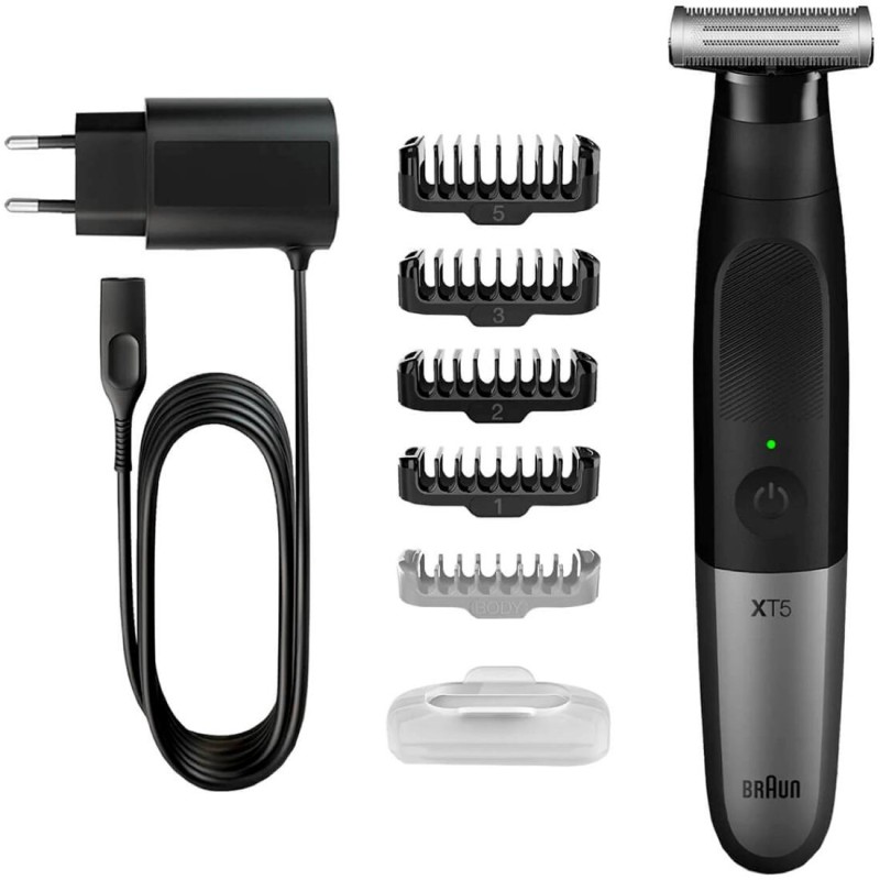 Braun XT5100 cortadora de pelo y maquinilla Negro, PlataBraun XT5100. Color del producto: Negro, Plata, Longitud mínima del cabello: 1 mm, Longitud máxima del cabello: 5 mm. Fuente de energía: Batería, Tipo de batería: Batería integrada. País de origen: China. Ancho: 125,5 mm, Profundidad: 56 mm, Altura: 190,5 mm. Peso del paquete: 336 gCaracterísticas:Desempeño:Color del producto: Negro, PlataLongitud mínima del cabello: 1 mmLongitud máxima del cabello: 5 mmCortapelos para barba: 1 mmSuites para todo el cuerpo: SiMojado y seco: SiRecortador de precisión: SiMaterial de la cuchilla: Acero inoxidableErgonomía:Sin cables: SiA prueba de agua: SiLavable: SiIndicación:Indicadores LED: SiControl de energía:Fuente de energía: BateríaRecargable: SiTipo de batería: Batería integradaOtras características:País de origen: ChinaPeso y dimensiones:Ancho: 125,5 mmProfundidad: 56 mmAltura: 190,5 mmPeso: 192 gEmpaquetado:Peso del paquete: 336 gContenido del embalaje:Cantidad de peines: 5
