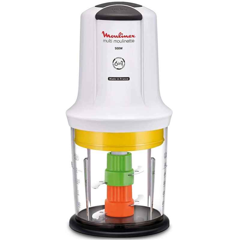 Moulinex AT723110 Picadora de 500W 6 en 1 Blanca¡La picadora de verduras Multi Moulinette proporciona una solución única para preparar la comida de 6 maneras diferentes! Utiliza las 2 cuchillas afiladas para picar hierbas, verduras y carne y la cuchilla dentada para moler especias, café o picar hielo. Añade el accesorio para salsas para preparar deliciosas emulsiones. Esta picadora de verduras es compacta pero tiene un potente motor de 500 W, y su amplio bol puede contener hasta 300 g/500 ml.¡La minipicadora Multi Moulinette es sumamente versátil, reúne todas las funciones que necesitas a diario para picar cualquier ingrediente!Características Picadora Moulinex AT723110:Gracias a sus cuchillas exclusivas puedes obtener los resultados esperados en cuestión de segundos: las cuchillas afiladas proporcionan resultados de excelente calidad en hierbas, verduras y carne, mientras que las cuchillas dentadas, junto con el potente motor de 500 W, han sido diseñadas para proporcionar un alto rendimiento a lo largo del tiempo en ingredientes duros como los granos de café y el hielo.Utiliza también el accesorio para salsas para preparar deliciosas salsas caseras como la mayonesa La Multi Moulinette es fácil de usar gracias a su sencillo sistema de presión, es práctica gracias a su base 2 en 1, que actúa de base antideslizante y tapa de conservación, es apta para el lavavajillas y fácil de limpiar gracias a sus cuchillas desmontables.La minipicadora es compacta y fácil de guardar, ya que todos sus accesorios caben en el bol, e incluye además un guardacable.Las cuchillas dentadas han sido diseñadas para proporcionar un alto rendimiento a lo largo del tiempo en ingredientes duros como los granos de café y el hielo.Esta picadora de verduras dispone de un potente motor de 500 W.La picadora de verduras Multi Moulinette es fácil de usar gracias a su sencillo sistema de presión.La base 2 en 1 hace que sea muy práctica, ya que es antideslizante.Fácil de limpiar. La tapa y las cuchillas son aptas para el lavavajillas.¡Prepara comidas deliciosas y variadas en cuestión de segundos con la picadora de verduras Multi Moulinette! Con sus 2 cuchillas afiladas podrás picar hierbas, verduras y carne, mientras que su cuchilla dentada te permitirá moler especias, café o picar hielo. Además, con el accesorio para salsas podrás crear deliciosas emulsiones caseras. Su motor de 500 W y su amplio bol hacen de esta picadora una solución única y potente. ¡No te preocupes por el espacio, su diseño compacto y su base antideslizante la hacen fácil de guardar! ¡La Multi Moulinette es la herramienta versátil que necesitas en tu cocina!