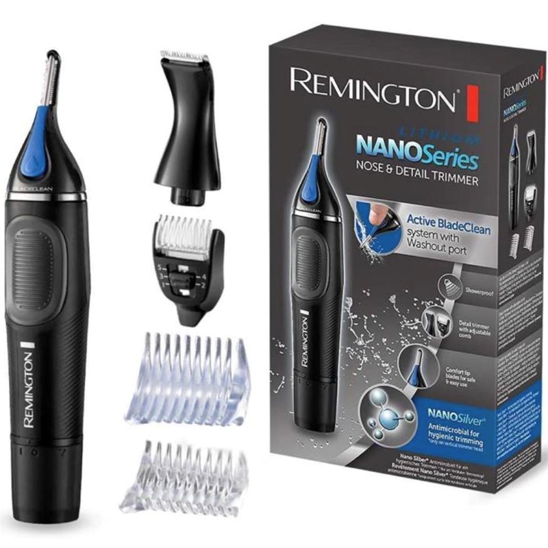Remington NE3870 E51 Retocador facial y nasalEl recortador facial de precisión Nano Series Lithium de Remington hace que eliminar el vello indeseado sea pan comido. No puedes conseguir un look impoluto sin una herramienta impoluta; el cuerpo exterior antimicrobiano y el sistema Active BladeClean te sustituyen en las tareas de mantenimiento resistiéndose a las bacterias acumuladas, mientras que con solo pulsar un botón las cuchillas se abren y puedes lavar los restos de pelo en segundos.Emparejado con una tecnología de puntas cómodas, esta herramienta de cuidado personal elimina el riesgo de irritación de la piel y maximiza la precisión gracias a su cortador vertical doble; así no tienes que complicarte la vida para conseguir un look impecable y sin riesgos.El recortador Nano Series con pila de litio es, también, perfecto para los acabados, pues cuenta con un recortador de precisión con peine ajustable, ideal para dar forma a las patillas y perfilar la barba. Además, conseguirás siempre unos acabados impolutos gracias al mango ergonómico, pues tendrás todo el control para la máxima precisión.Este recortador, resistente al agua y equipado con una batería de litio de larga duración, no te decepcionará nunca y se convertirá en la herramienta perfecta para garantizar la mejor versión de ti mismo.FACILÍSIMOEl cuerpo exterior antimicrobiano con Nano Silver* y el sistema Active BladeClean con puerto de lavado te ahorran complicaciones al limpiarlo, mientras que las cuchillas de puntas cómodas te permiten ir más deprisa sin preocuparte por los cortes y rasguños.Especificaciones:Sistema Active BladeClean con puerto de lavado para un fácil mantenimientoCuerpo exterior antimicrobiano con Nano Silver para un corte higiénicoRecortador vertical dobleCortador de precisión con peine ajustable (1-5 mm)Cuchillas de puntas cómodas de uso fácil y seguroPeines guía verticales para cejasResistente al aguaEmpuñadura ergonómicaPila de litio incluidaGarantía de 2 añosComprar Remington NE3870 E51 Retocador facial y nasal en Canarias.