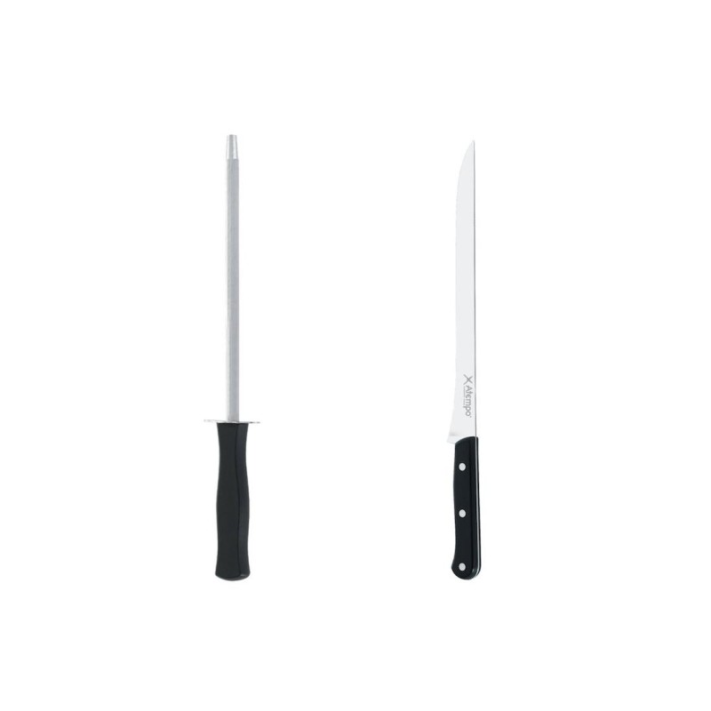 Atempo 101-01 Pack Jamonero + Chaira Tempo BlackEl pack Atempo 101-01 Jamonero + Chaira Tempo Black es la solución perfecta para los amantes del jamón que buscan una forma eficiente y elegante de cortar y mantener su jamón en óptimas condiciones. Este pack incluye un jamonero de alta calidad y una chaira para mantener el filo del cuchillo.Jamonero Atempo 101-01El jamonero Atempo 101-01 es un accesorio imprescindible para disfrutar al máximo del jamón. Este jamonero está fabricado con materiales duraderos y resistentes, lo que garantiza su estabilidad y seguridad durante el corte. Su diseño ergonómico permite un corte preciso y cómodo, facilitando la extracción de lonchas finas y uniformes.Chaira Tempo BlackLa chaira Tempo Black incluida en este pack es ideal para mantener el filo del cuchillo jamonero. Fabricada con acero inoxidable de alta calidad, esta chaira permite mantener el filo del cuchillo en perfectas condiciones para obtener cortes precisos y limpios. Su diseño ergonómico y su mango antideslizante garantizan un agarre seguro y cómodo.Con el pack Atempo 101-01 Jamonero + Chaira Tempo Black, podrás disfrutar de un corte de jamón profesional en tu propia casa. Ya sea para ocasiones especiales o para el día a día, este pack es la elección perfecta para los amantes del jamón que buscan calidad y elegancia en sus utensilios de corte.